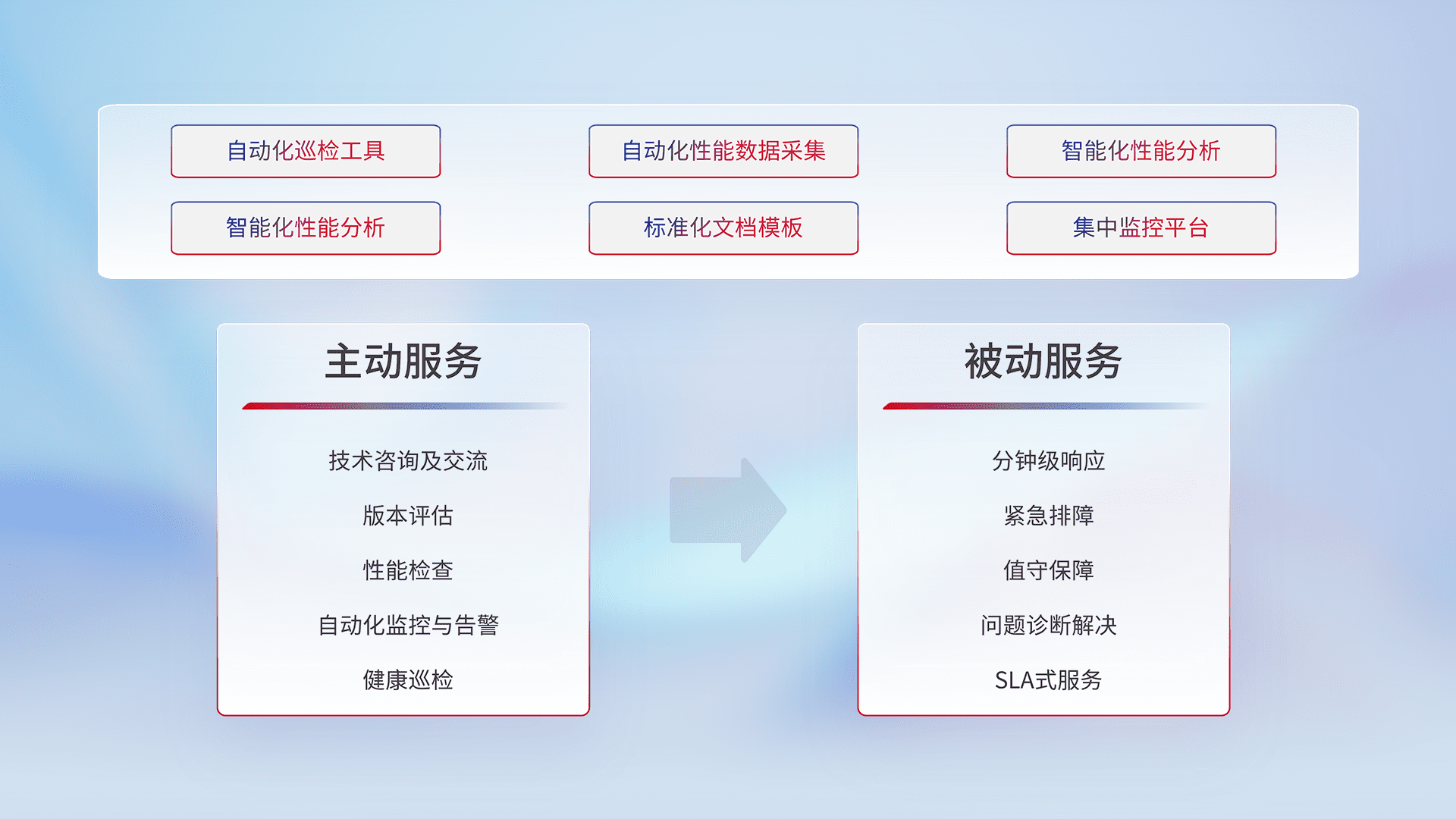 智能化工具和标准化文档,,,保障服务质量,,,,提供主动服务(包含技术咨询、、、、版本评估、、、、性能检查、、、、自动化监控与告警、、、健康巡检)和被动服务包含(分钟级响应、、紧急排障、、值守保障、、问题诊断解决、、SLA服务)。。。。